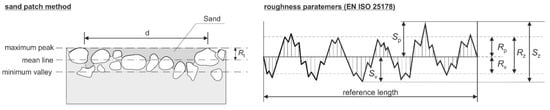 An alternative, and more exact, method is using digital microscopy. The 3D-measured topology of the interface provides valuable data on the micro-texture of the interface and can be quantified afterwards using different depth and surface roughness parameters, e.g., following the definitions in EN ISO 25178 [32]. In this context, the maximum height , the maximum peak height and the maximum valley depth (from the mean line) as well as mean peak to mean valley depth are useful parameters (compare Figure 2).