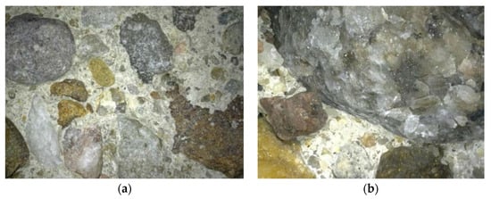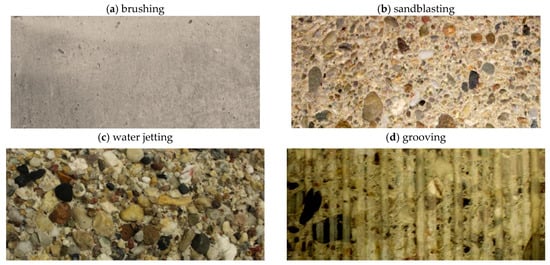 After interface treatment, each surface was inspected visually to detect possible damages or specimen features of each method (compare Figure 7). The inspections showed in some water-jetted specimens similar damages of aggregate and aggregate-cement paste bond in form of microcracks or aggregate splitting as depicted in Figure 7b.