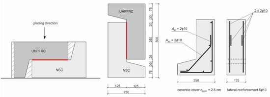 In addition to the test specimens, reference cylindrical specimens (Ø/h = 150/300 mm) were produced from the same batch for the investigation of material properties of hardened NSC and UHPFRC. The reference tests were conducted at the age of testing, which was 35 days for NSC and 7 days for UHPFRC [39]. The mean values of material properties are provided in Table 4 at the testing age of the push-off specimens.