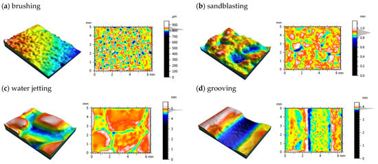 Comparison between the surface topology of the brushed (a), sandblasted (b), water-jetted (c) and grooved (d) substrates.