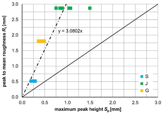 It should be noted that, because of the described measurement procedure (several measurements of one surface), the maximum values of peak and height correspond to the mean values despite using the definitions and notation of EN ISO 25178 in Table 5 (). Moreover, most roughness parameters are shown to be correlated with each other, which is affected, e.g., by the microstructure of the substrate (especially the aggregate size). For the NSC substrate of the tested specimens, a correlation between the peak to mean roughness determined using the sand patch method and the maximum peak height is shown in Figure 9.