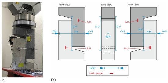 Setup of push-off tests (a), applied strain gauges and LVDTs to the test specimens (b).