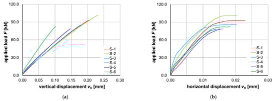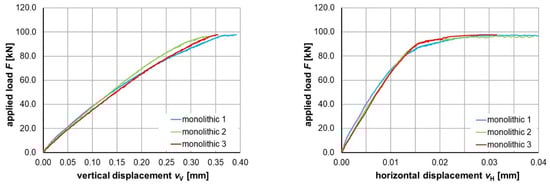 Load-vertical displacement (left) and load-horizontal displacement (right) of shear failure plane of monolithic specimens.