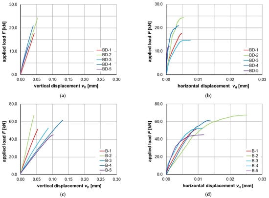 Load-displacement of the shear interface with brushed dry (a,b) and brushed wet (c,d) interface treatment.