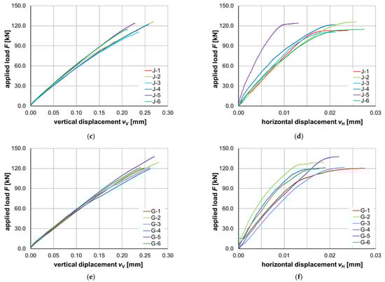 Load-displacement of the shear interface of sandblasted (a,b), water-jetted (c,d) and grooved (e,f) interface treatment.