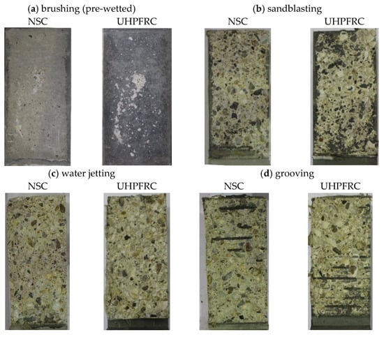 The tensile bond strength values are compared in Table 6 with the uniaxial tensile strength () of the substrate. It should be noted that the uniaxial tensile strength is determined as according to the recommendation in [31]. The comparison shows that the bond strength is lower than the uniaxial tensile strength for all specimens and lower in the case of water-jetting compared to sand-blasted and grooved interfaces, which can be reasoned by the observed pre-damaged substrates of water-jetted interfaces (compare Figure 7). A further observation was the changing failure mode of pull-off tests with increasing surface roughness. Some grooved (G) and sandblasted interfaces (S) showed a mixed failure mode with the failure plane locating in both NSC and UHPC. This might be also an additional reason for the higher tensile bond strength of these specimens in comparison to water-jetted specimens (J) with the failure plane in NSC.