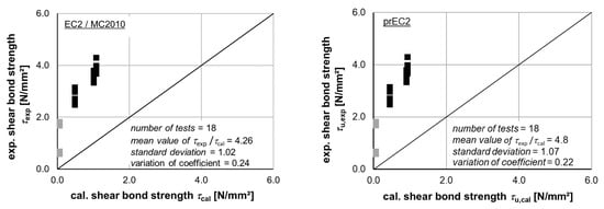 Experimental shear bond strength vs. predicted shear bond strength with the design approach of EC / MC2010 (left) and predicted shear bond strength with the design approachof prEN (right).