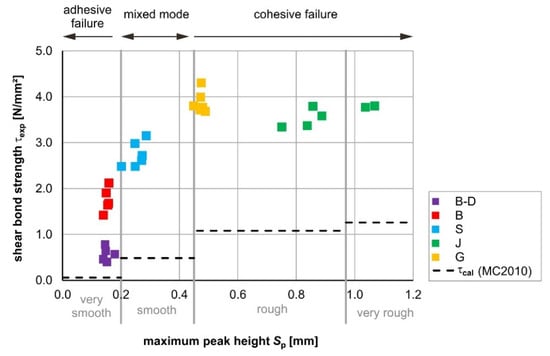 Based on Figure 17, it can be further observed that a linear or power correlation between maximum peak height and the shear bond strength is more representative, which reaches a certain plateau (at a shear bond strength value ) observed as a cohesive failure mode with the failure plane locating in NSC substrate. In fact, the results make apparent that for rough and very rough interfaces the cohesive failure is the dominant failure mode and should be considered as an upper bound of shear bond strength for NSC-UHPFRC interfaces. That means that above a certain roughness no further increase in the load-bearing capacity is obtained. Therefore, using efficient treatment methods that produce a well-defined interface texture, such as the grooving method is suggested for NSC-UHPFRC interfaces.