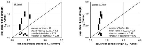Experimental shear bond strength vs. predicted shear bond strength with the calculative approach of Gohnert (left) and predicted shear bond strength with the calculative approach of Santos & Julio (right).