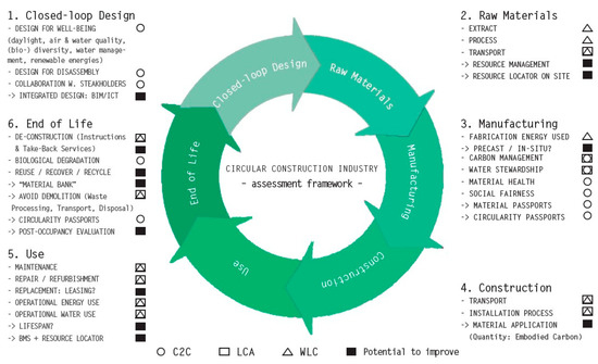 Furthermore, livability, especially in cities, could be improved through better indoor and outdoor air quality using healthier materials and more effective mobility systems, reducing congestion and pollution. Significant reduction of unprocessed waste in open-air dumpsites and enhanced wastewater treatment systems would improve hygienic conditions significantly and reduce environmental pollution caused by leachate and toxic materials. This loop can be expanded to food production and other industrial sectors. Further benefits of circular economy thinking in construction are illustrated based on the case study project in Section 3. Several assessment tools have been developed to assess circularity and life cycle impacts of buildings, a few of which will be introduced in the following sections.