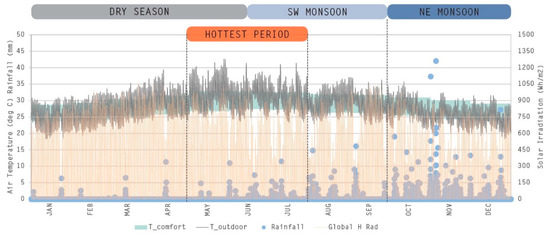 The project site is located at 13° N and 80° E in the tropical wet and dry climate zone (Aw) according to the Koeppen-Geiger climate classification. The proximity to the equator and the Eastern Coastal Plains results in annually high temperatures, humidity and solar radiation (with only slight seasonal changes). Annual average temperatures are 28–29 °C with average humidity levels of 72%. Annual solar irradiation on unobstructed horizontal surfaces is around 1900 kWh/m2, see Figure 8.
