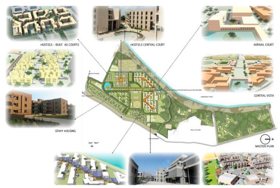 Thirdly, indicators, assessment schemes and precedents of sustainable universities—so called ‘green campuses’—As well as the ‘ReSOLVE framework’, which is based on circular economy principles, were analysed, enhanced and translated into the first ‘Circular Campus Guideline’. Based on these findings, a project specific ‘Circular Campus Vision and Action Plan’ was established. The masterplan design for a new university campus in Andhra Pradesh caters for 10,000 students and 2000 members of staff on an 89 ha site.