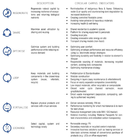 - Hopff, B.; Nijhuis, S.; Verhoef, L. New Dimensions for Circularity on Campus—Framework for the Application of Circular Principles in Campus Development. Sustainability 2019, 11, 627. [Google Scholar] [CrossRef] [Green Version]