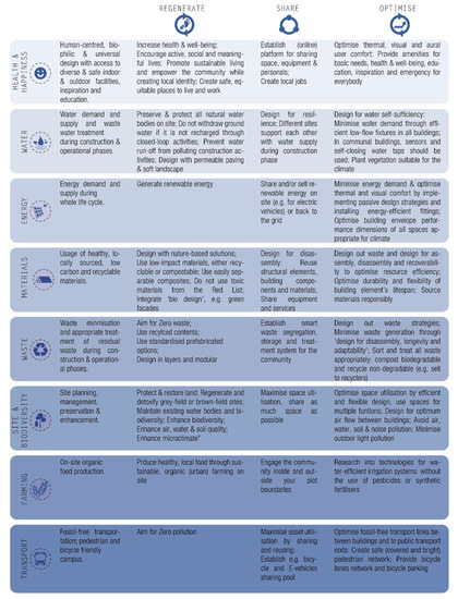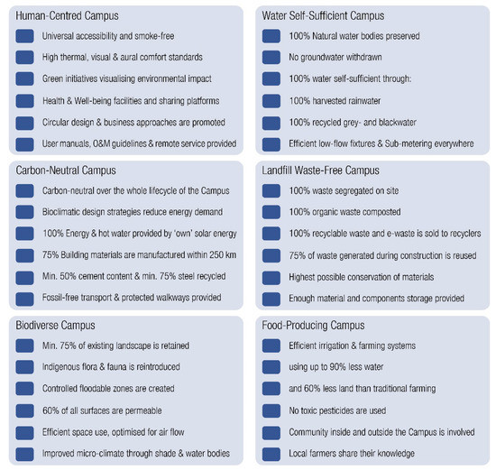 Universities have been serving as role models for communities over centuries and serve as excellent vehicle to drive change in the way we build sustainable neighbourhoods, as the future generations studying at the universities will build and inhabit the cities of tomorrow. As Hopff et al. [17] point out, various universities have set up Green Offices or sustainability managers to drive the sustainable development of campuses. However, implementing change in the organisation of a university is challenging [18], with sustainability objectives not being integrated coherently nor supported actively by university management. This emphasises the importance and opportunity of establishing a framework and practicable guideline at the very beginning of planning a new university campus.