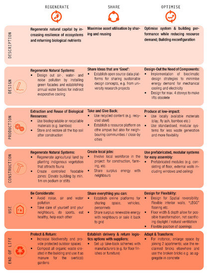 The application of circular economy thinking in the building sector requires thinking beyond the brief, taking initiative in ‘doing better’, designing buildings that can be adapted (changed), disassembled, moved and reassembled with the minimum effort in terms of materials, energy and costs [25]. Consequently, waste generation and CO2 emissions are reduced significantly. After minimising demand, regenerative resources should be prioritised and smart water, energy and waste management systems established, where ‘waste’ is transformed into an asset.