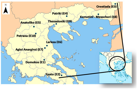 The 10 test locations (listed with codes from E1–E10; Figure 1) included 5 Regions across Greece, as follows: south, the region of Sterea (St); central, the region of Central Greece (Ce); north, the regions of Central Macedonia (CM) and West Macedonia (WM); and northeast, the Region of Thrace (Th).