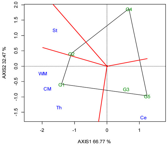 GGE biplot with the “which-won-where” pattern based on the seed yield of five lentil genotypes (abbreviated, G1–G5) across ten locations, based on two-year data in a regional grouping (where: St, Sterea; WM, West Macedonia; CM, Central Macedonia; Th, Thrace; Ce, Central).
