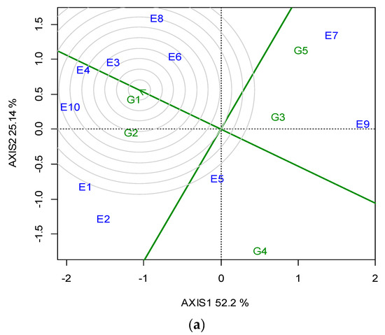 Across the ten locations, the closest to the “ideal” for SY and stability was G1, followed by G2; however, G1 was the most stable (Figure 3a). The “ideal” locations in terms of representativeness and discriminating ability were E3 and E4, followed by E10 (Figure 3b).