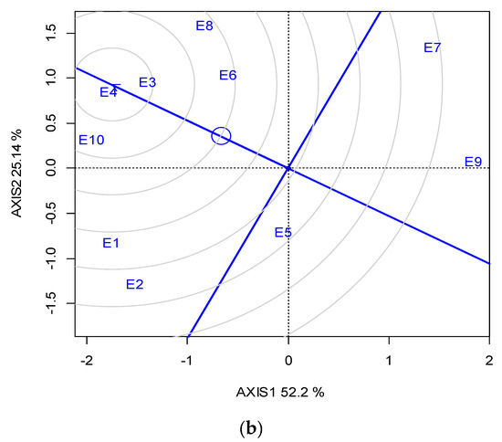 GGE biplot based on the seed yield for (a) the ranking of five lentil genotypes against the “ideal”, (b) the ranking of the ten locations (abbreviated, E1-E10) against the “ideal” (the ideal is the most representative and discriminating) for two growing seasons (2019 and 2020).