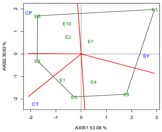 GGE biplot with the “which-won-where” pattern based on the seed yield (SY), crude protein (CP) and cooking time (CT) of five lentil genotypes across the ten locations (abbreviated, E1–E10) for two growing seasons (2019, 2020).