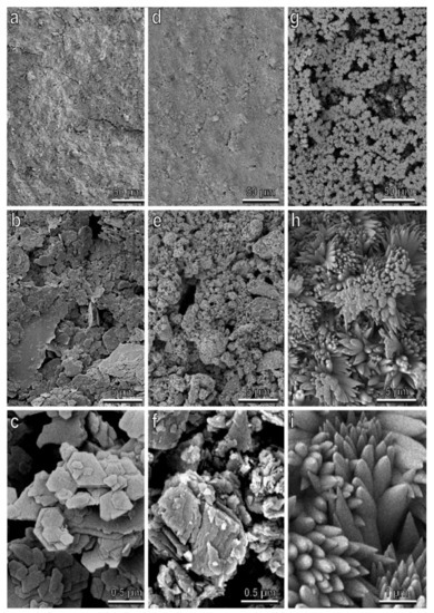 Kaolin (a–c), zeolite (d–f), and calcium carbonate (g–i) particle film sprayed on glass, visualized with cryo-SEM at progressively higher magnifications (from (a,d,g) to (c,f,i), respectively). (a) Uniform film encrusting the surface; (b,c) layers of polygonal-shaped, horizontally placed plates; (d) uniform film encrusting the surface; (e,f) plates with variable shapes and dimensions forming groups oriented at different angles to the surface; (g) non-uniform film consisting of flower-shaped crystals forming groups separated from each other; (h,i) flower-shaped crystals at higher magnifications composed of numerous pointed digitations.