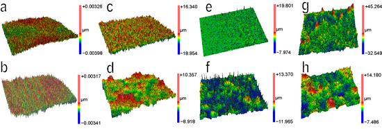 3D surface profiles of untreated (a,b) and treated glass (c–h), with kaolin (c,d), zeolite (e,f), and calcium carbonate (g,h) particle film. The long side length equals to 1400 µm (a,c,e,g) and 140 µm (b,d,f,h) (see Table 1).