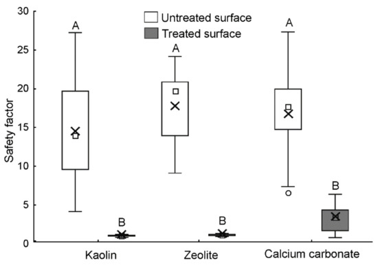 Safety factor (traction force divided by the insect weight) obtained in traction force experiments with Nezara viridula on treated (covered by kaolin, zeolite, or calcium carbonate) and untreated glass. Boxplots show the interquartile range and the median (square), whiskers indicate 1.5 × interquartile range, and shows the arithmetic mean. Boxplots with different letters are significantly different at p < 0.05, Wilcoxon matched pairs test.