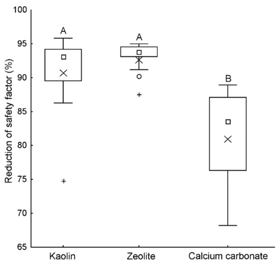 Percentage of reduction in the safety factor of Nezara viridula on glass covered by the different particle films (kaolin, zeolite, and calcium carbonate) in relation to the untreated glass. Boxplots show the interquartile range and the median (square), whiskers indicate 1.5 × interquartile range, shows the arithmetic mean, ° shows the outliers and + shows the extremes. Boxplots with different letters are significantly different at p < 0.05, Kruskall–Wallis ANOVA followed by multiple comparisons.
