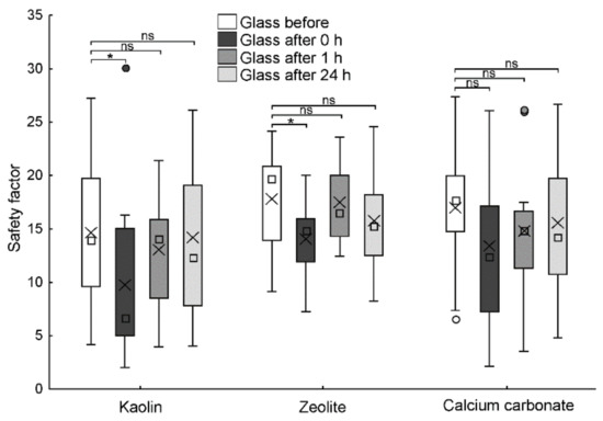 Safety factor (traction force divided by the insect weight) of Nezara viridula on untreated glass, before and after walking on treated surfaces (kaolin, zeolite, and calcium carbonate) at different time intervals (0 h, 1 h, and 24 h). Boxplots show the interquartile range and the median (square), whiskers indicate 1.5 × interquartile range, shows the arithmetic mean and ° shows the outliers. In the comparison between the safety factor on glass before and after walking on treated surfaces, an asterisk (*) means significantly different at p < 0.05, and ns means not significantly different (repeated measure ANOVA, Dunnett test).