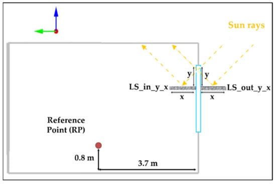 Following the main design criteria found in the literature [], horizontal light shelves, made of wood with a white coating, have been designed, both internal (LS_in) and external (LS_out), as shown in Figure 3. Ten different geometrical configurations have been taken into account, five on the internal and five on the external side. They are characterized by different distances from the top of the window (y) and width (x), as shown in Table 2. For instance, LS_in_30_60 is the inner LS with a distance from the top of the window of 30 cm and an overhang of 60 cm. The geometrical, spectral, and thermal features of the designed LSs are reported in Table 2. Since fixing the distance of the LSs from the top of the window, the height from the floor is also fixed and provided in the table. This is because, according to several design criteria [], it is an important parameter to take into account for occupant wellbeing. Indeed, the LSs are usually placed above the eye level of the stand-up occupant in order to prevent the glare from their upper surface.