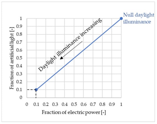 The lighting system is made of LED lamps equipped with presence- and illuminance-level sensors. The type of control is linear: the lights dim continuously and linearly from maximum electric power (5 W/m2) to minimum electric power as the daylight illuminance increases. It is the “daylight-integrated lighting control system” discussed in []. Figure 4 depicts the illustration of the relationship between the artificial light illuminance and electricity as fractions of maximum light output and electric power, respectively. When the daylight is null, the electric power and the light output of the LED system are maximum; then, the fraction linearly decreases as the daylight illuminance increases. The minimum fraction of the electric power is the lowest power the lighting system can dim down to, and the minimum fraction of artificial light is the lowest lighting output that the system can dim down to. The lights remain at their lowest electric power with a further increase in daytime illuminance. This behavior is active every day, from 7:00 to 24:00. The reference point (RP) for the control is placed in the room’s center 0.8 m from the floor (Figure 3), assuming that the student’s desk is located there. The artificial lighting system, when switched on, guarantees 500 lux on the RP.