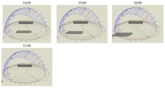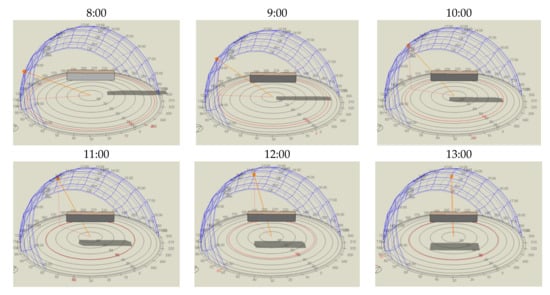 Comparing these results with other studies, the increase in cooling need has been observed in an office with the same latitude (37.97° N) by Kontadakis et al. [], who used an active sunlight redirection system mounted on a light shelf. Lee et al. [] state that, in the northern hemisphere, varying the tilt of a light shelf can increase the light flux entering the room, increasing the cooling load at the same time.