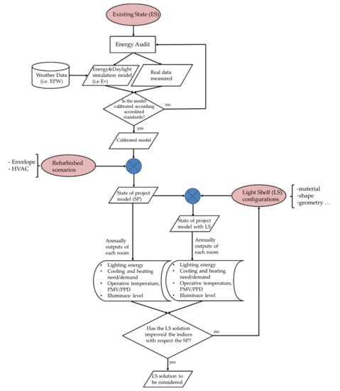 The methodological approach is similar to the one defined in [] but with some novelty elements. Figure 6 shows the flow-chart of the proposed methodology, which could be applied to any kind of buildings with different locations. On the basis of this study, the diagram was conceived in the case that the LS installation takes place at the same time as an energy refurbishment. Indeed, this situation is frequent, since measures that provide envelope building refurbishment are often joint to the whole HVAC–building system refurbishment [,]. Obviously, if the refurbished scenarios addition is deleted, then the chart continues to maintain its valence. In this case, the results will be referred to the improvement of the indices, by applying LSs with respect to the existing state of the building. On the other hand, if only the state of project subsists for the building, the calibration section could be avoided. Therefore, the method is easily replicable in other different conditions.