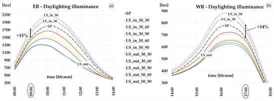 With respect to the SP, it is possible to obtain a maximum increase in illuminance of +14% ÷ 15% with LS_in_50_60 and LS_in_50_90 in the ER around 9:00 a.m. and with LS_in_50_60 in the WR, at 17:00 p.m. It is observed that LS_out configurations bring a reduction of illuminance level, because, in the simulation model, they reduce the flux transmitted through the window due to diffuse ground luminance. Only LS_out_30_30 can bring an increase in illuminance from +3% to +5% in the ER, during the last sunny hours of the day, and from +2% to +5% in the WR, during the early hours of the morning. This behavior could also depend on the daylight calculation method used in the EnergyPlus tool or on the reference point chosen for the analysis.