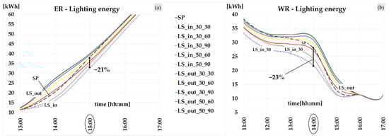 Figure 8 depicts the trends of the energy demand for lights by considering continuous dimming control, during the autumn equinox, for the east and west rooms. The maximum energy saving is reached at 14:00 ÷ 15:00 with LS_in_50_90 both for WR (−23%) and ER (−21%). It occurs during these hours because the rooms are occupied.
