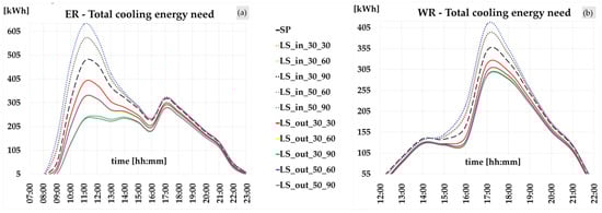 Considering the total cooling energy need of the two rooms, Figure 9, during the autumn equinox, the LS_in configurations show an increase in the cooling need. Indeed, looking at the solar diagram in Figure 5, the maximum increase in cooling need happens when the sun shines directly over the LSs, both for ER and WR. Under this condition, there is the maximum efficiency of LSs and so the maximum amount of light penetration [,]. In both rooms, with the application of LS_in, a variation of the cooling need with respect to the SP has been observed: