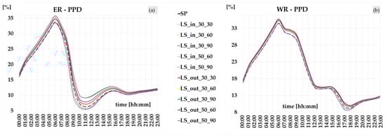 During the winter solstice, significant reductions in electricity for the lighting system have been observed, in particular of −40% at 12:00 for the LS_in_50_60 and LS_in_50_90 in the ER. For the WR, the maximum reduction is −9% at 13:00–14:00 in the LS_in_50_60 and LS_in_50_90 cases.