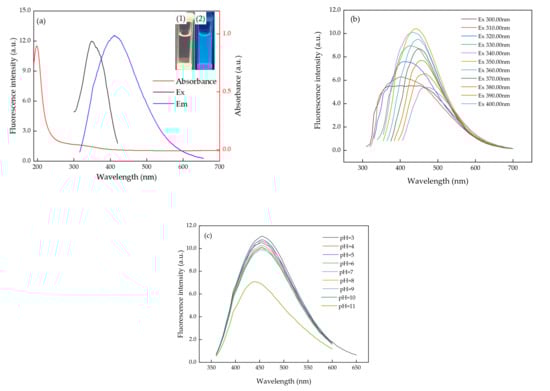 UV–Vis absorption spectrum and fluorescence spectra (a), fluorescence spectroscopy with different excitation wavelengths (b), and with different pH (c) of N, S-CDs.