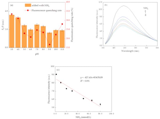 The fluorescence changes of N, S-CDs added to ammonia at pH 3–11 were studied. N, S-CDs exhibited the highest emission intensity (Figure 3c) and the fluorescence quenching was the most obvious at pH = 3 (Figure 4a); therefore, the pH value of 3 was used as the optimal condition for detecting NH3.