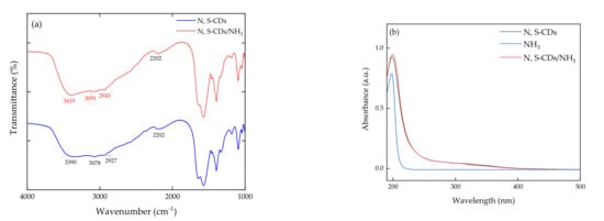 For studying the reactivity of N, S-CDs with ammonia, the FTIR spectra of N, S-CDs and N, S-CDs/NH3 powder were obtained. Because the N, S-CDs/NH3 solution may release NH3/NH4+ with drying, there were no obvious differences between the FTIR spectra of N, S-CDs and N, S-CDs/NH3. However, the FTIR spectra of N, S-CDs/NH3 had obvious blue shifts at 3390, 3077 and 2927 cm−1, which may be caused by the electronic induction effect as shown in Figure 5a. In order to gain further insight into the reaction mechanism, UV–Vis spectra of N-CDs, ammonia solution and N, S-CDs/NH3 were measured, respectively. As shown in Figure 5b, UV–Vis spectra of N-CDs and N, S-CDs/NH3 were nearly unchanged, which indicated that N, S -CDs did not react with ammonia [24]. It can be concluded that the sensing mechanism was not static quenching. Furthermore, the fluorescence decay lifetime of N, S-CDs and N, S-CDs/NH3 were measured, respectively. As shown in Figure 5c, lifetimes of the N, S-CDs solution and N, S-CDs/NH3 showed a triexponential fit with an average lifetime of 5.19 ns and 4.12 ns, respectively. The time-resolved fluorescence results are list in Table 1. The fluorescence decay lifetime of N, S-CDs decreased in the presence of ammonia, showing static quenching and internal filtering effects cannot change the fluorescence decay lifetime, so the quenching mechanism between N, S-CDs and NH3 is dynamic quenching, which was in agreement with UV–Vis results.