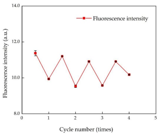 The difference between a fluorescence sensor and a fluorescence probe is the reversibility of fluorescence changes. We studied the reproducibility of N, S-CDs to detect ammonia by adding ammonia and HCl to the N, S-CDs solution alternately. As shown in Figure 8, over four cycles the CDs sensor had good recovery, which indicated that N, S-CDs have a good reversible performance in ammonia detection.
