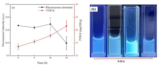 In addition, the freshness of bighead carps was detected by the N, S-CDs sensor. As shown in Figure 9a, TVB-N content of bighead carps (red line) increased with the storage time; at the 24th hour of storage, TVB-N content was 21.6 mg/100 g, exceeding the recommended freshness standard of TVB-N in freshwater fish muscle (20 mg/100 g), which indicated that the bighead carps were spoiled [33]. The fluorescence intensity of N, S-CDs was almost unchanged in the first 16 h of storage, which may be because the concentration of volatile amine gases produced by the deterioration of the fish in the early storage period was lower than the detection limit of N, S-CDs; while in the 24th hour of storage, the fluorescence intensity decreased about 20%. The photographs of N, S-CDs solution stored with bighead carps were taken by smartphone under UV light (360 nm) over time, as shown in Figure 9b. It can also be seen that the fluorescence intensity of N, S-CDs was obviously decreased at the 24th hour, which agrees with the fluorescence measurement results. The results showed that although N, S-CDs could not indicate the freshness of the fish at the initial stage of storage, they could be used to determine whether the fish was spoiled. Therefore, the N, S-CDs synthesized in this paper could be used as a low-cost rapid detection sensor for fish spoilage.