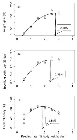 Relationship between feeding rate and weight gain (a), specific growth rate (b) and feed efficiency (c). The optimum feeding rate for juvenile mandarin fish Siniperca scherzeri was estimated based on the quadratic broken-line regression analysis for weight gain (%) and specific growth rate (%), and on the quadratic (second-order polynomial) regression analysis for feed efficiency (%) against feeding rate (%), respectively.