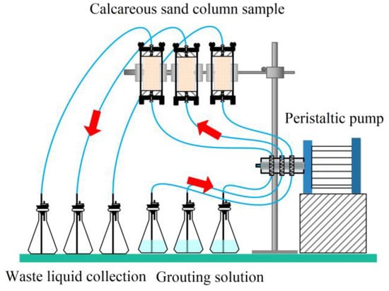 A schematic diagram of the grouting process of the peristaltic pump is shown in Figure 2. In the test, a PVC pipe with an inner diameter of 3.5 cm and height of 8.0 cm was used as the sand column mold. The homogenized calcareous sand was filled in three layers, vibrated and compacted, and the mass of the sand column was controlled to be 105 ± 1 g, the initial void ratio is about 45.35%. After filling, a 160 mesh round nylon filter with a diameter of 3.5 cm was placed at the end of the sand column to prevent the loss of sand particles. The pipe caps at both ends and the sand column were fixed with a fixed bracket to ensure that the volume of the sand column was constant in the process of grouting reinforcement. Before the bracket was fixed, a silicone gasket was placed in the pipe cap to prevent liquid leakage during the process of grouting. To avoid the occurrence of a gas cavity in the process of grouting and prevent the grouting fluid from filling the whole sand column unevenly, the sand column was vacuum saturated before grouting mineralization, and the filled sand column was fixed in the saturator and put into the vacuum cylinder. Vacuum saturation occurred through the suction machine.