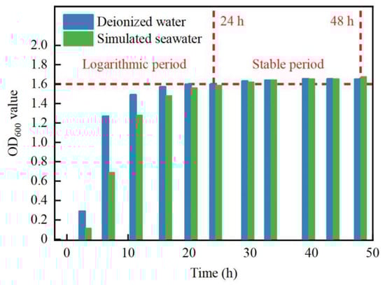 In the simulated seawater environment, due to the increase in osmotic pressure and ionic strength, the number of bacteria in the logarithmic phase was lower and there was a lag compared with normal growth, so simulated seawater had an adverse effect on Sporosarcina pasteurii. However, after 24 h, in the stable period of bacterial culture, the inhibition was basically lifted, especially in the harvest period of Pasteurella multocida in 48 h, and the OD600 value of Sporosarcina pasteurii cultured in simulated seawater was even slightly higher than that under normal conditions. This shows that Sporosarcina pasteurii can adapt to this kind of simulated seawater environment, can grow and reproduce normally, and can be used as a candidate bacteria for microbial mineralization under simulated seawater conditions.