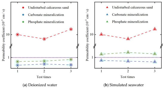 Effect of mineralization treatment on the permeability of calcareous sand in different environments. (a) Deionized water (b) Simulated seawater.