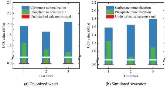 The results of the UCS test are shown in Figure 6. After mineralization treatment, the mechanical strength of calcareous sand is obviously improved, and the average UCS strength is higher than 1 MPa. In comparison, the strength of UCS after carbonate mineralization is higher, while that of UCS after phosphate mineralization is slightly lower, which corresponds to the change in permeability. As the carbonate mineralization products fill more pores, it is not easy for calcareous sand particles to move relatively to each other after experiencing stress. Especially after mineralization, the original loose sand cementation as a whole greatly improves the mechanical strength. The effect of salinity on the UCS strength is similar to its effect on permeability. After adding sodium chloride, the UCS strength of the calcareous sand column decreases to varying degrees, while the UCS strength of calcareous sand treated with phosphate mineralization decreases more. As the reaction in the process of phosphate mineralization is more complex and affected by a variety of regulatory factors, the mineralization effect may be more sensitive to the existence of adverse effects.