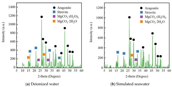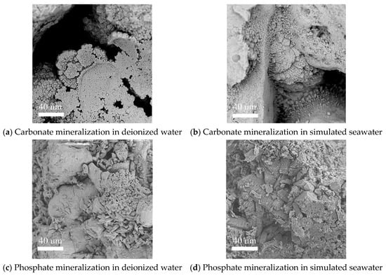 Figure 7c,d shows that after phosphate mineralization, under the condition of deionized water, the main phosphate mineralization product is an obliquely long column, which is speculated to be magnesium ammonium phosphate, and there are some irregular cluster-like substances, which may be byproducts. The phosphate mineralization products accumulate in the pores between particles and are cemented to the surface of calcareous sand particles; under the condition of simulated seawater, the morphology of long columnar magnesium ammonium phosphate changes obviously, and the oblique column of magnesium ammonium phosphate is mainly formed by lamellar crystal stacking. There are obvious pores between flake crystals, and there are a large number of irregular mineralization products in the figure. In recent studies, it has been found that salinity has an effect on the stacking structure of magnesium ammonium phosphate; this causes the crystal shape to change from a long column to a flake [], which is consistent with the results of this experiment. The lamellar accumulation retains some pores, and the seepage channel is retained, so it easily moves and compresses under stress and the mineralization effect is lower than that under deionized water.