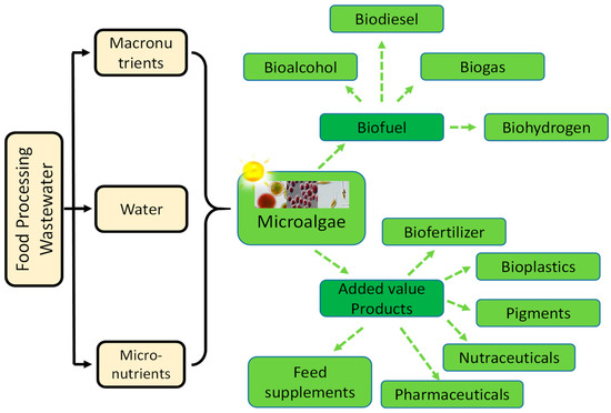 Microalgae require the micronutrients (iron, magnesium, and calcium), and macronutrients (nitrogen and phosphorus) for their growth, which are present in food processing WW. Along with the remediation, several potential value-added products such as biofuel, protein, amino acid, polysaccharide, and functional pigment, can also be produced (a representative pictorial diagram has been provided in Figure 2. Previous research works demonstrated that microalgae could grow in different WWs leading to simultaneous treatment and biomass production. Thus, microalgae may be the most promising feedstock for producing biodiesel to replace conventional diesel fuel.