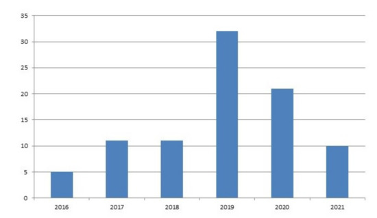 The year 2019 reported more than 30 items articles in the single year. The year 2020 observed a decline in the number of publications as compared to 2019. However, this trend seems to be on track to reverse again in 2021, as within four months, the year 2021 achieved a sharp increase in publications, accounting for up to more than 10 articles. Therefore, it can be predicted that by the end of the current year (2021), there will be a higher amount of publications within the field of agility in Industry 4.0.